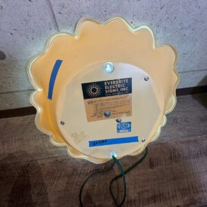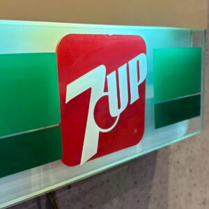サイケデリックな花柄とレインボーサンのデザインは、当時の“アンコーラ(The Uncola)”キャンペーンの世界観そのまま。センターに大きく配された7UPロゴが空間の主役になり、点灯すると柔らかな光がレトロなムードを一気に演出します。今では滅多に出会えない復刻希少モデルで、アメリカ雑貨好きにはたまらない一台です。